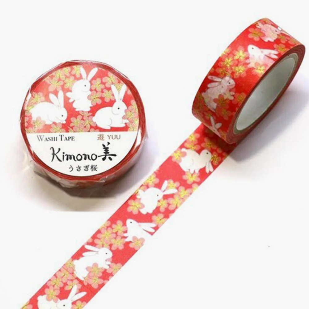 וואשי טייפ Rabbit Sakura מסדרת Kimono, מציג דוגמה יפנית מסורתית בצורה עכשווית ומדויקת. עשוי מנייר דק ומעט שקוף אך עדין שומר על חוזק, עם הטבעת פויל זהב ודוגמה של ארנב לבן בין פרחים זהובים. נקרע בקלות ביד ואידיאלי ליצירה ואריזת מתנות. מעוצב ומיוצר ביפן.