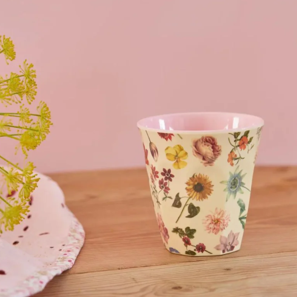 כוס מלמין בעיצוב פרחוני המציג פרחים שונים על רקע קרם עדין, פנים הכוס צבוע בגוון ורוד בהיר. הכוס חזקה במיוחד אך קלה לנשיאה, היא אידיאלית לפיקניקים, מסיבות ולשימוש יומיומי עם ילדים.
