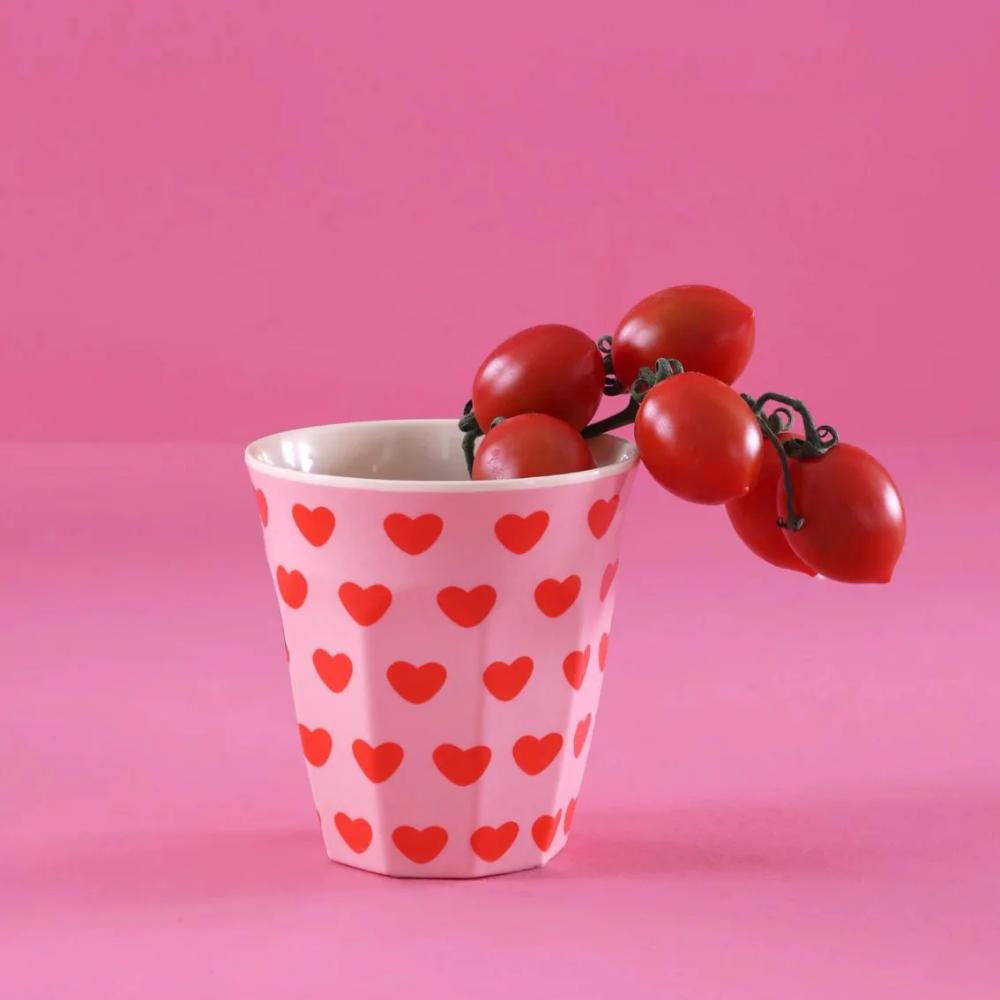 כוס מלמין בעיצוב מתוק של לבבות אדומים על רקע ורוד עדין, פנים הכוס צבוע בגוון קרם. הכוס חזקה במיוחד אך קלה לנשיאה, היא אידיאלית לפיקניקים, מסיבות ולשימוש יומיומי עם ילדים.