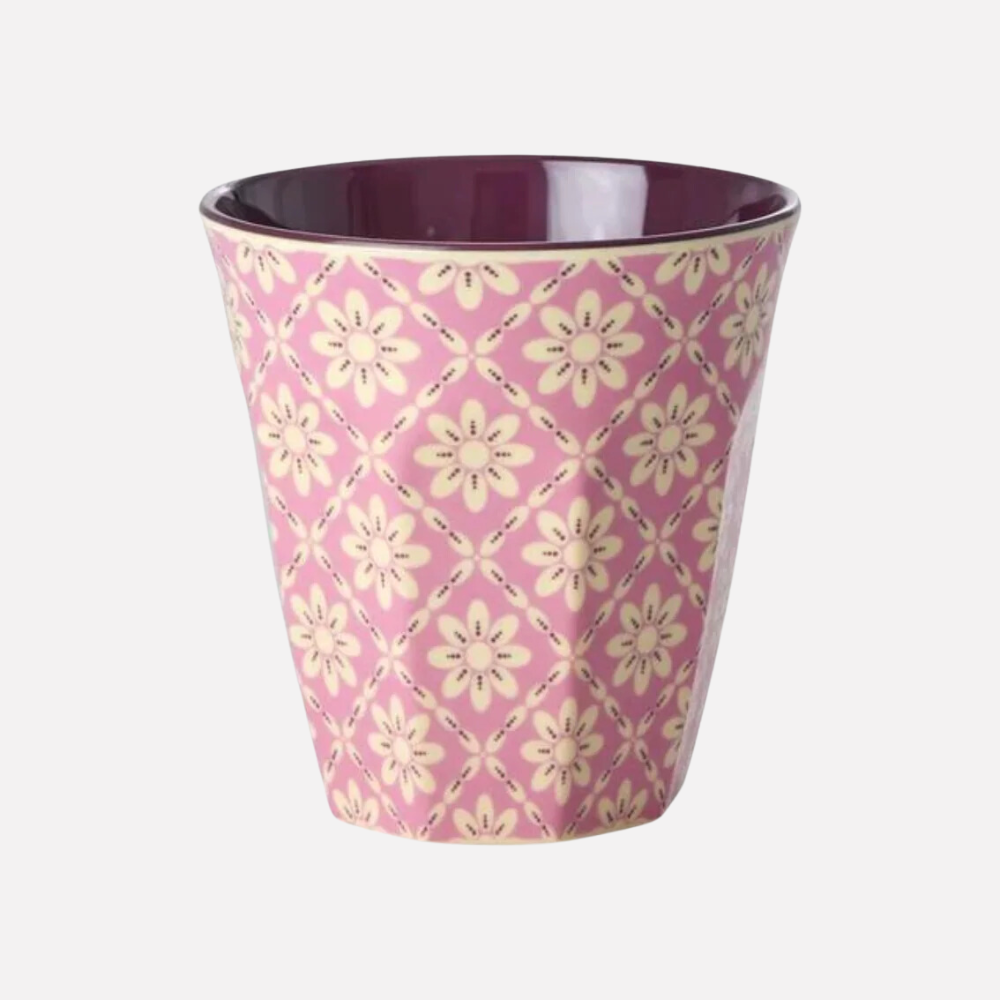 כוס מלמין בעיצוב פרחוני על רקע ורדרד, פנים הכוס צבוע בגוון סגול כהה. הכוס חזקה במיוחד אך קלה לנשיאה, היא אידיאלית לפיקניקים, מסיבות ולשימוש יומיומי עם ילדים.