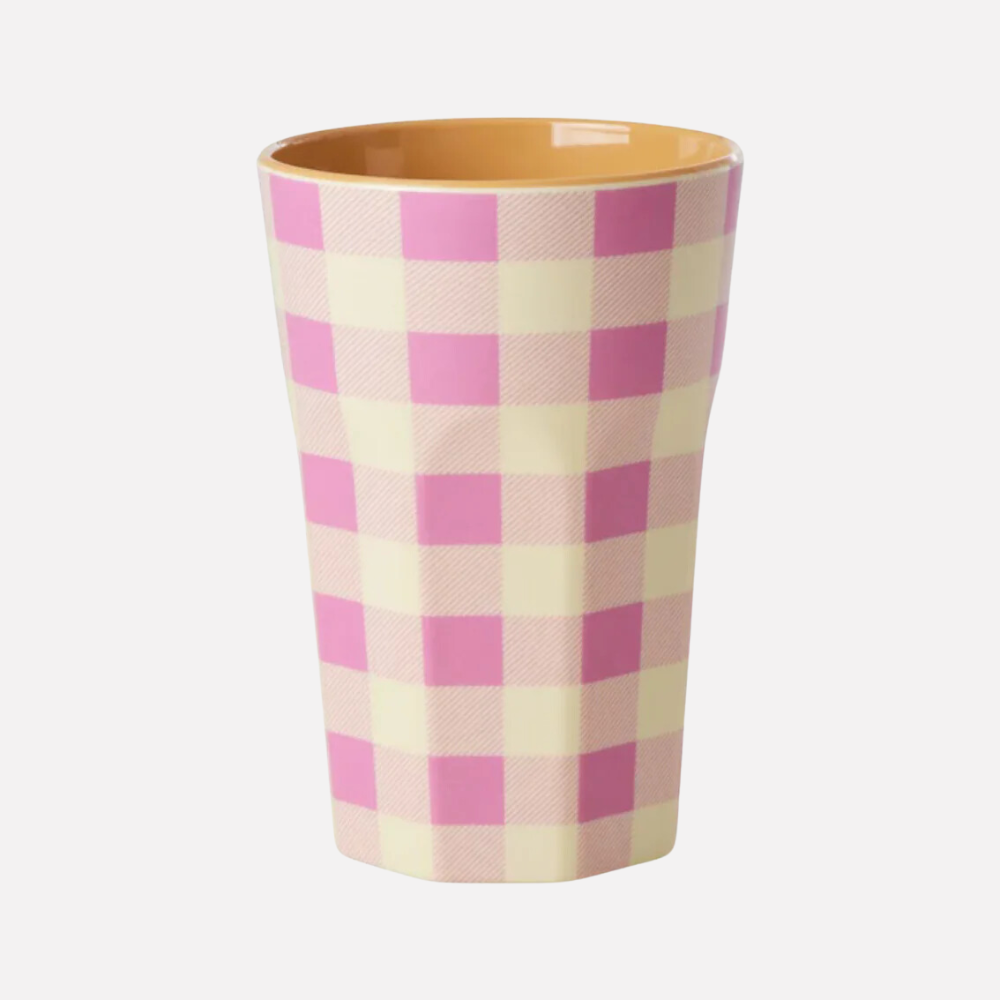 כוס מלמין בעיצוב משבצות בצבע ורוד על רקע קרם עדין, פנים הכוס צבוע בגוון כתום. הכוס חזקה במיוחד אך קלה לנשיאה, היא אידיאלית לפיקניקים, מסיבות ולשימוש יומיומי עם ילדים.