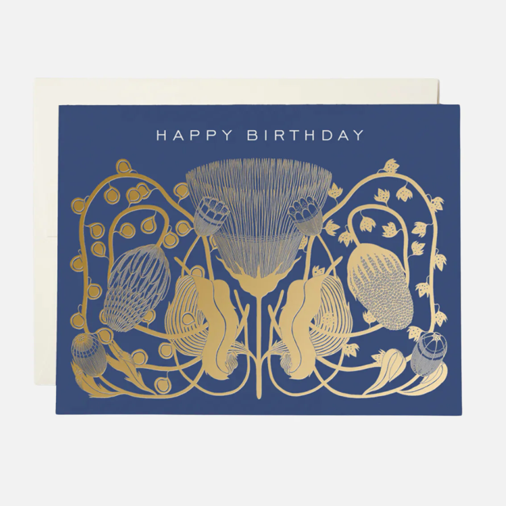 כרטיס ברכה לכבוד יום ההולדת. איור בוטני בסגנון ארט נובו מוטבע בפויל זהב חגיגי על רקע כחול בגוון קובלט. הברכה מגיעה עם מעטפה לבנה תואמת. יוצר בארה"ב ואויר על ידי מרשה רובינסון עבור Red Cap Cards.