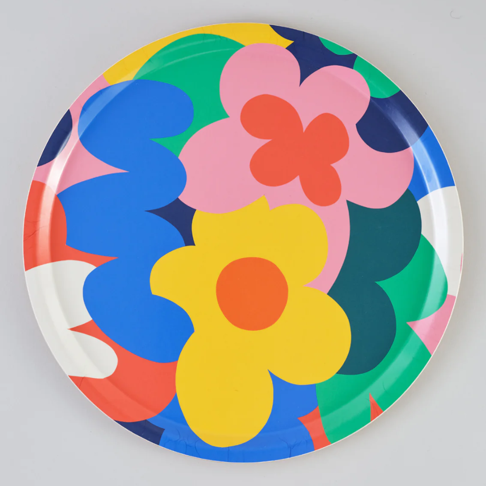 המגש עשוי מעץ לבנה בעבודת יד בשבדיה, עם דוגמה פרחונית גרפית ששולחת אותנו בדילוגים לסיקסטיז.