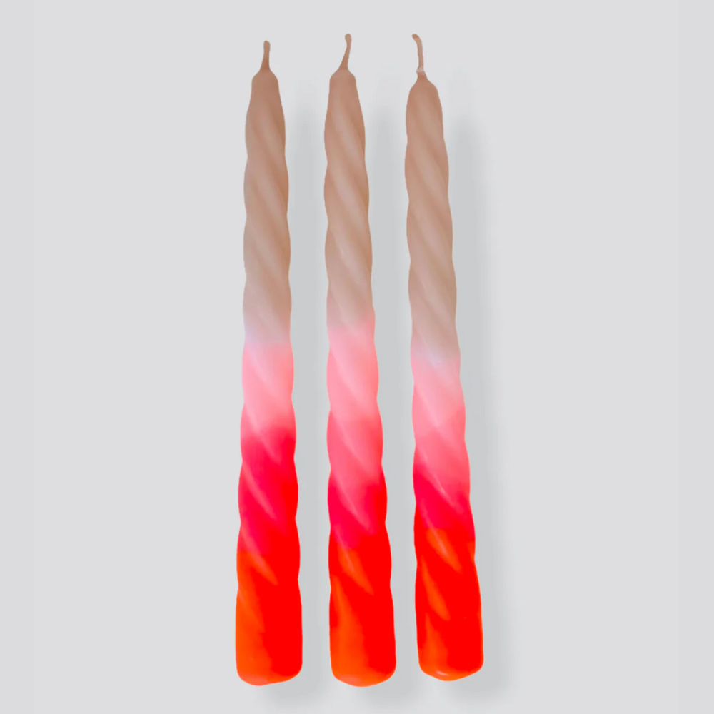 סט של 3 נרות איכותיים ו-100% טבעוניים, נעשים ונצבעים בעבודת יד בבוואריה על ידי טבילה של הנרות פעם אחר פעם בתוך צבעי השעווה השונים. הצבעים נשארים זהים מנר לנר, אך יש הבדלים קלים בדוגמה.