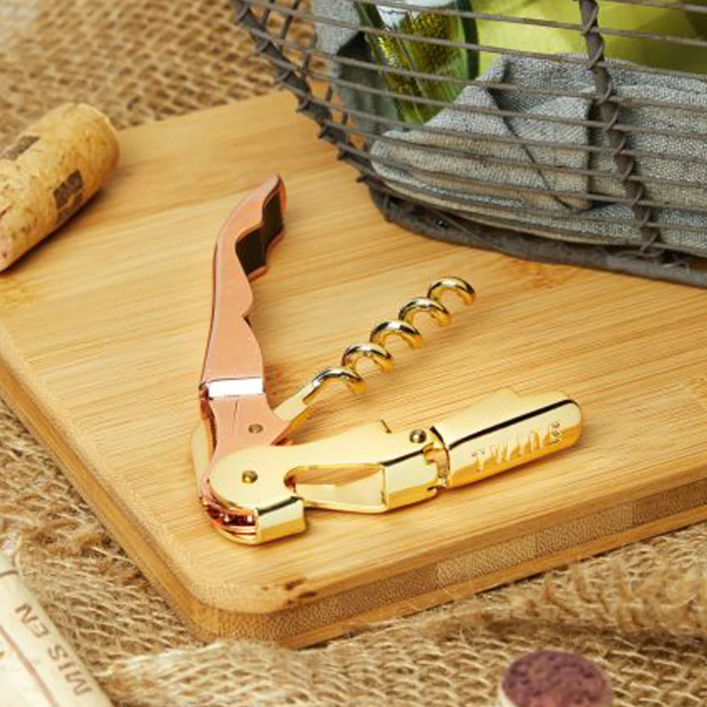 פותחן לבקבוק יין מבית המותג TWINE. הפותחן המעוצב בתחכום, שומר על המאפיינים הקלאסיים של פותחן מנצח ומשלב בתוכו נחושת וזהב בגוון רוזגולד שעוטפים אותנו מיד באלגנטיות.