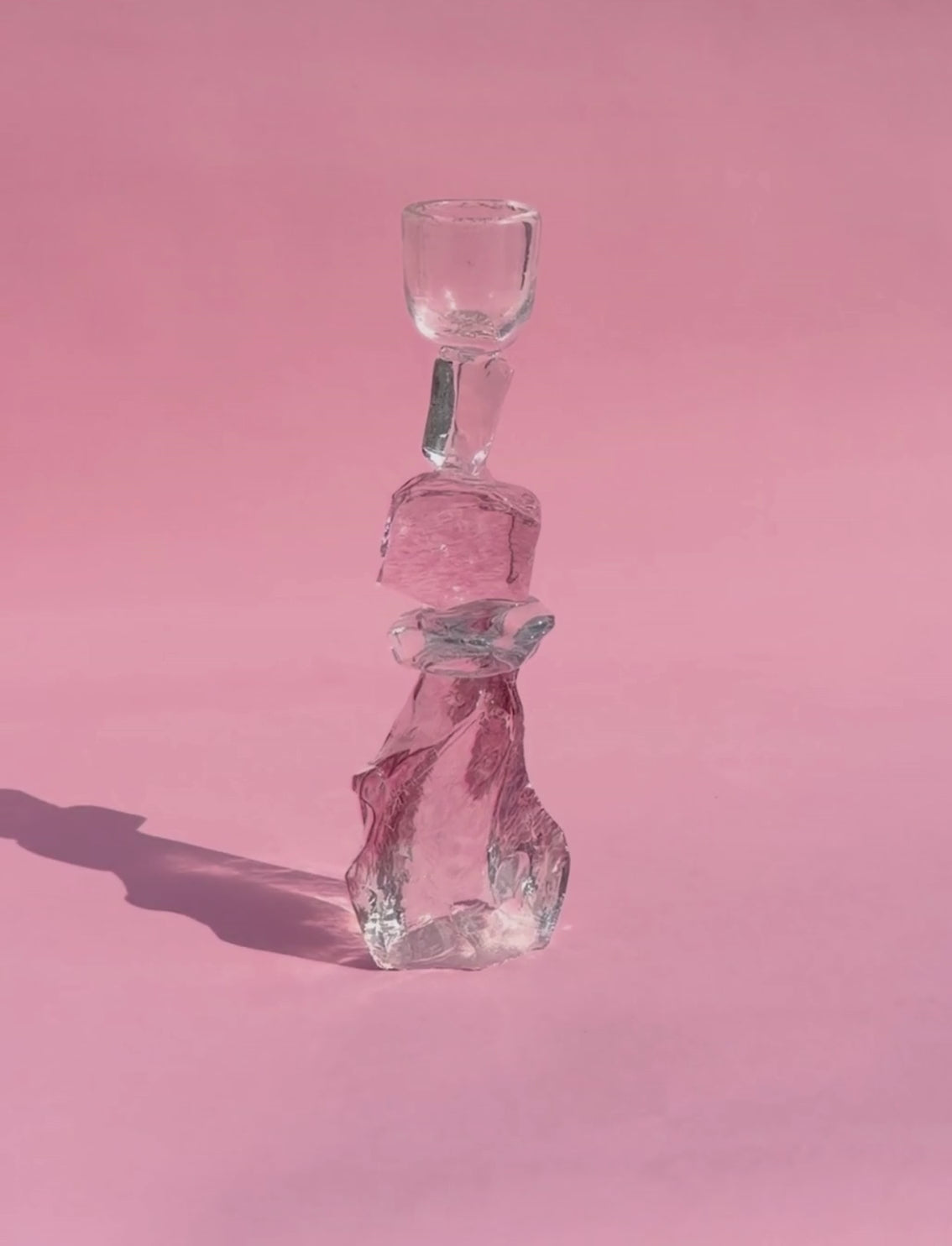 הצורה הסלעית נוצרת משבירה של גושי זכוכית, תהליך שנותן לחומר להוביל ולא מנסה ליישר או לייפות אותו. זו יצירה שמחבקת את חוסר השלמות, ומוצאת בו יופי, אופי ונוכחות.