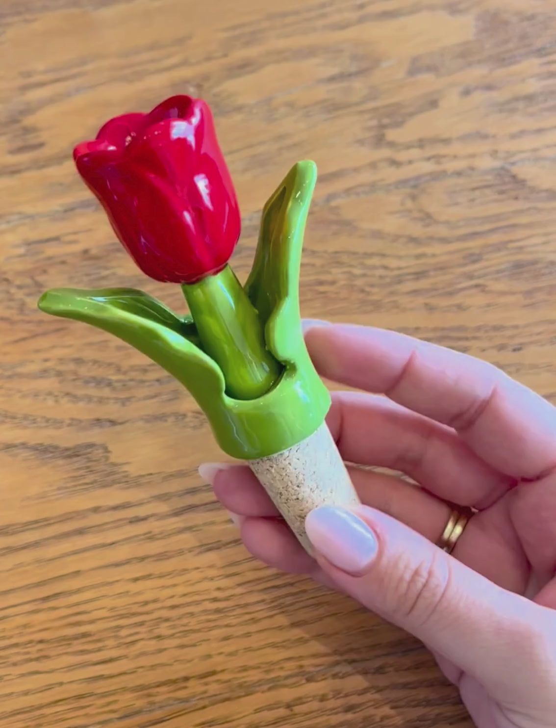 פקק לבקבוק יין מעוצב כטוליפ אדום, פריט פרקטי וחינני שמוסיף טאץ' אביבי ומשמח. הפקקים עשויים דולומיט (סוג של קרמיקה) ונצבעים בעבודת יד. מעוצב בהולנד.