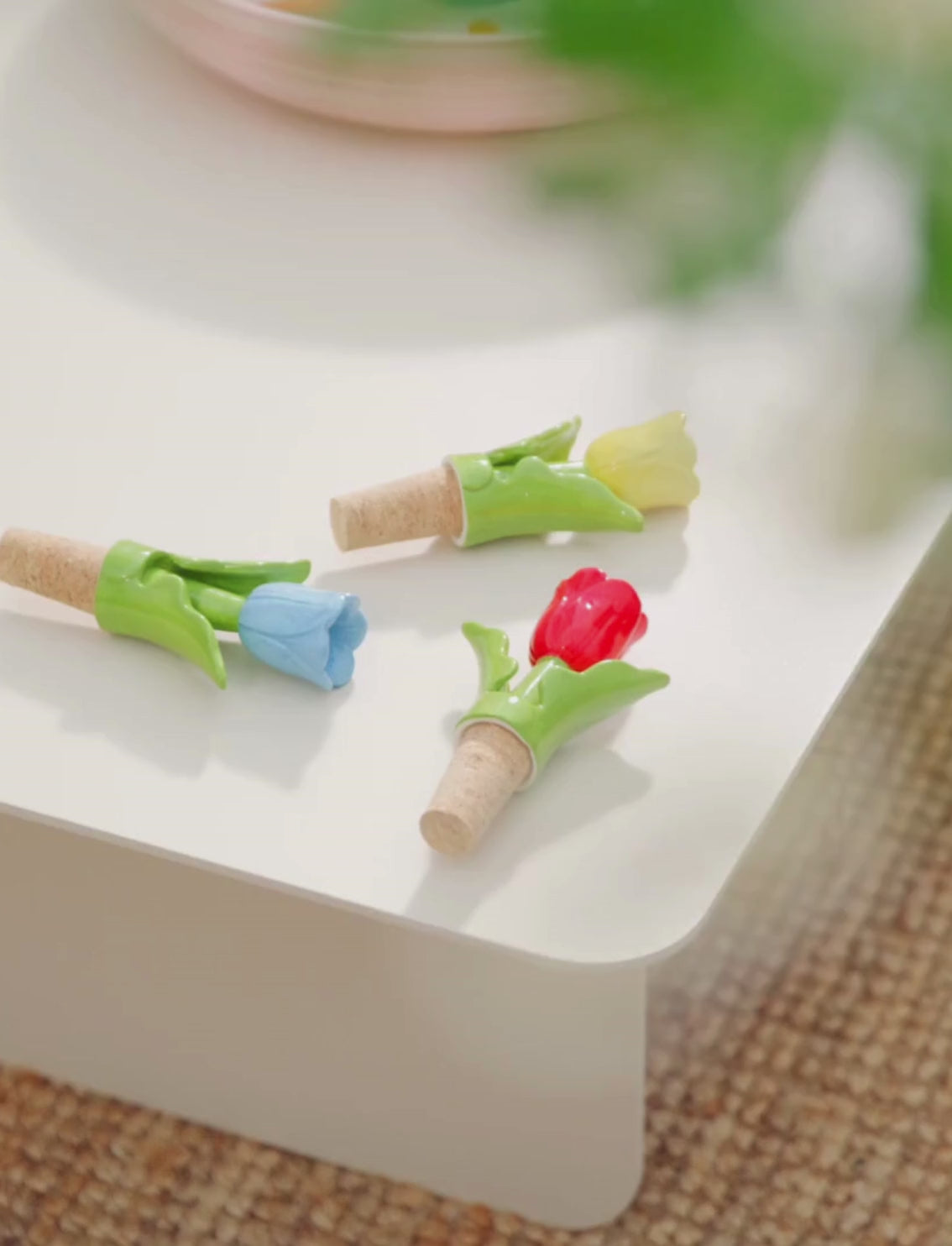 פקק לבקבוק יין מעוצב כטוליפ צהוב, פריט פרקטי וחינני שמוסיף טאץ' אביבי ומשמח. הפקקים עשויים דולומיט (סוג של קרמיקה) ונצבעים בעבודת יד. מעוצב בהולנד.