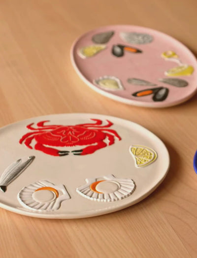 צלחות הגשה לה מר משלבות בין וינטג' עכשווי לבין העולם המופלא של מתחת למים. הצלחת מצופה בהדפס יד מרהיב עם פרטים מוקפדים, והאלמנטים המופיעים עליה הם למעשה תבליט. מעוצב בהולנד.