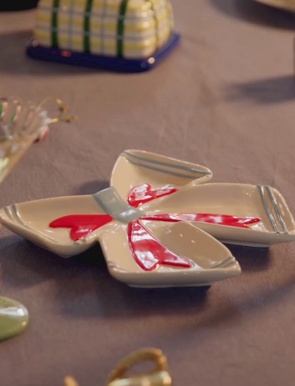 צלחת הגשה בצורת פפיון היא הטוויסט המשחקי המושלם לכל שולחן אירוח או פינה בבית שזקוקה לפופ של צבע. הפרטים הצבעוניים נצבעים בעבודת יד ומשווים לכל צלחת את האופי הייחודי שלה. מעוצב בהולנד.