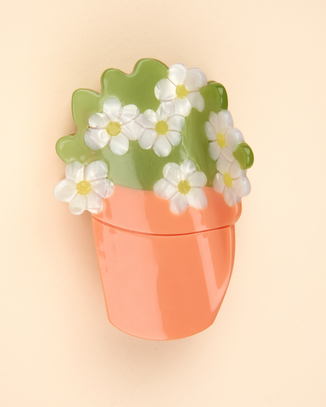 קליפס לשיער מעוצב כעציץ טרקוטה עם שיח פרחים לבן - מתוך קולקציית האביב של המותג הצרפתי Coucou Suzette. הקליפס עשוי בעבודת יד מתאית אצטטית - חומר בר קיימא ומתכלה. בעקבות הייצור הידני ייתכנו שינויים קטנים בדוגמה מפריט לפריט. כל פריטי המותג מגיעים בשקיות מתנה ממותגות של Coucou Suzette.