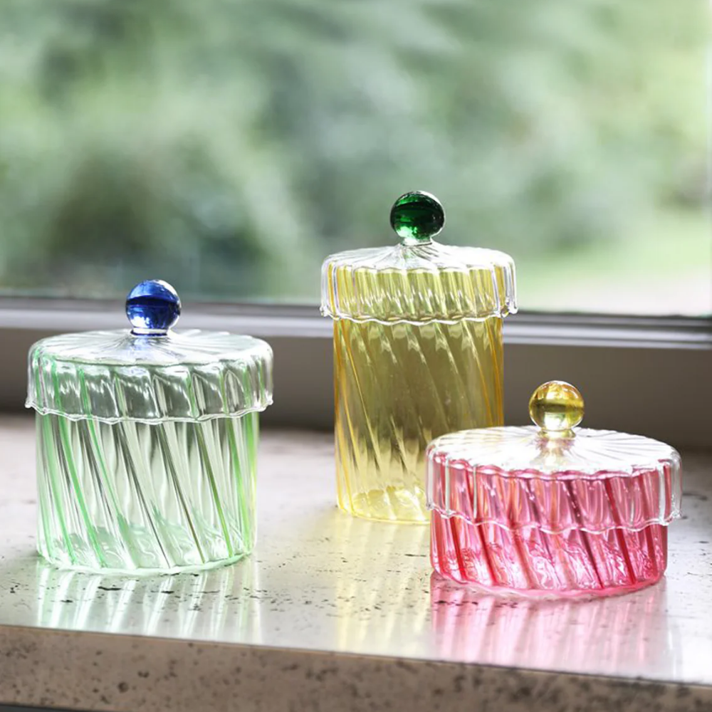 צנצנת זכוכית עדינה בצבע צהוב עם מכסה בצבע שקוף וידית עגלגלה בצבע ירוק. הצנצנת עוצבה בהשראת עיצובי שנות ה-50 תוך שימוש בצבעוניות מתוקה בדוגמה סיבובית ומפותלת שהייתה אהובה מאוד באותה תקופה בכלי בית. המכסה התואם מבטיח שכל הפריטים שתבחרו לשים בתוך הצנצנות יישמרו בבטחה.